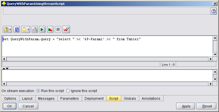 set QueryWithParam.query = "select " >< '$P-Param1' >< " from Table1"
