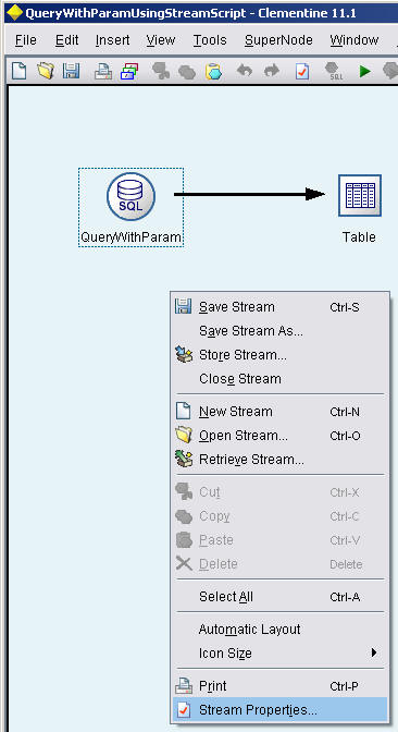Fig. 2. The database- and table node on the canvas, then selecting "Stream Properties".