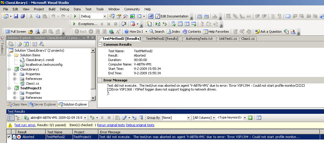 Now, when you run your unit test and you're running from a network drive, you will get an error:
