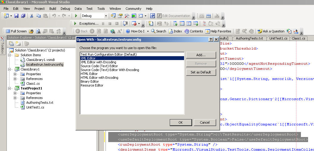 (this time use the test configuration editor instead of the XML editor):