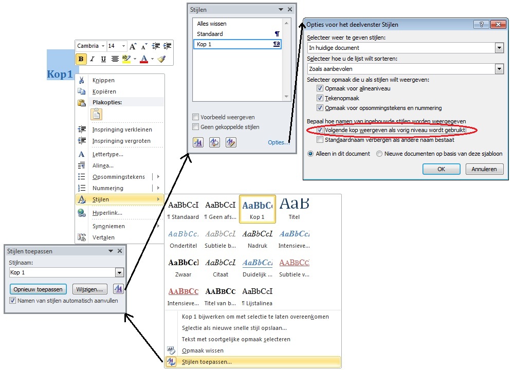 Klik op "opties", en vink "Volgende kop weergeven als vorig niveau wordt gebruikt." aan.